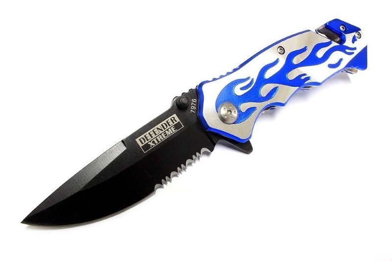 4.75″ Flame Design Blue Handle Black Blade Knife