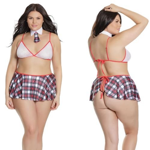 Schoolgirl Lingerie Fishnet Bralette W/ Plaid Knit Skirt & Collar White OSXL